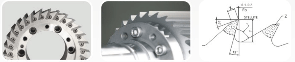 回轉切刀基體采用耐腐蝕不銹鋼材質,刀刃材料采用全進口STELLITE 12#鈷基合金,通過高科技數控等離子堆焊成型。從原材料的選擇、熱處理工藝控制、堆焊技術的優(yōu)化升級以及全部數控加工中心切削研磨,全部過程本公司內部嚴格控制,確保每一把切刀高品質要求。回轉切刀的性能技術參數指標及使用壽命完全等同進口產品。